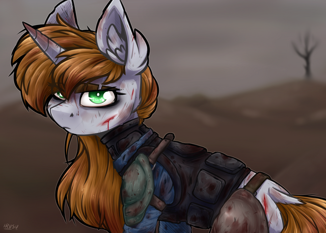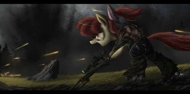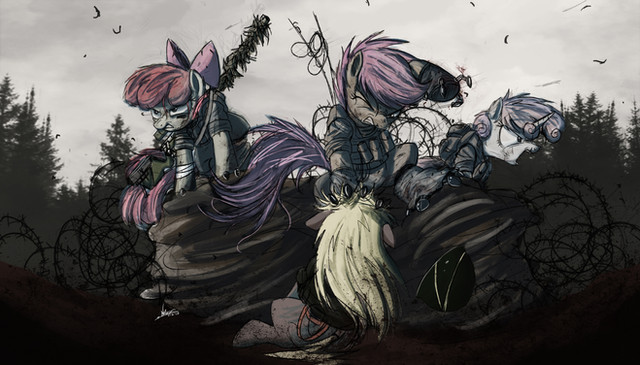 aww poor AppleBloom. She looks so haunted. I want to check out the story but these pic's kind of scare me off. I am too much a softie for ponies in war.