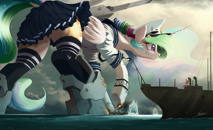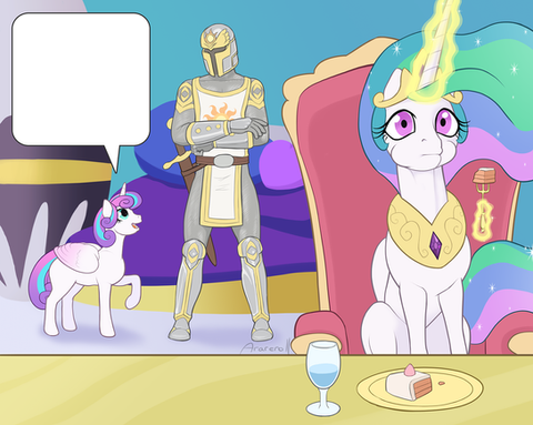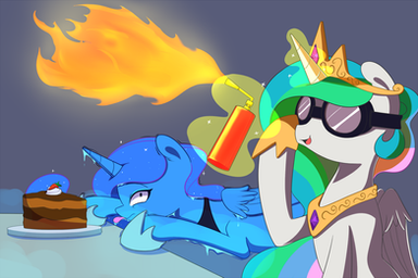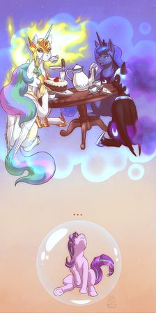 Celestia: “I see” Now on her hooves, she complimented the officers and turned to her sister.“Luna” she said tenderly as she embraced the Princess of the Night, her cake smeared muzzle close to her ear. “There will be a reckoning, Dear Sister”