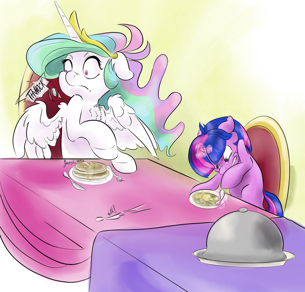 Celestia: “Aurds…mut iss tha meaning off dish” she said with cake in her mouth.