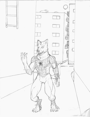 Nick's hypercharged legs carried him faster and faster up and down the alleyway to his house. All of a sudden, it felt as though his entire body had cramped up and he stopped his motion. He managed to drag himself behind a dumpster as the pain pulsed through every muscle in his body and his heart pounded like a sledge hammer. His arms from the elbow down ached terribly for some reason. He forced his eyes open and watched painfully as his forearms extended and thickened to about a third longer than they previously were. Then his hands seemed to continue the stretch as his palms grew longer. He started to scream as an overwhelming pain entered his legs, but the sound did not come. Instead he felt some sort of garbling sensation in his throat. He glanced at his legs and watched as his ankle moved up on his calf and he felt his feet begin to extend inside of his shoes. All the while an underlyin itchiness had been building up. As his shirt began to raise up due to his swelling upper body, he could see fine gray hairs sprouting all over his mid-section. It was growing on his legs, and on his arms it appeared as well. He then felt a great pressure on his face, and once again the scream died in his throat. His mouth and nose had begun to push out from his face as his ears moved up the sides of his head. The gray hair covered his face as his nose and mouth formed a muzzle, he felt a grinding in his teeth and soon enough the two canines in the front on his bottom row had grown out about eight inches and come into view over his snout. His ears grew large and pointed, and the black hair on his head spread down the sides of his face, his neck and down to the middle of his back. HIs neck stretched and lengthened, and he choked for a moment. All the while the gray fur coated his body and the muscles beneath swelled greatly. Finally, his shirt gave way to his swollen body. His torso was positively rippling with power, and his arms looked as though he could tear an SUV in half. He continued to stare at his hands in shock. His fingernails hardened and formed curved claws, and the skin on his palms grew rough and turned black, transforming into pads. A series of pops met his ears and he looked down to find that his shoes had come off, revealing digitigrade legs with large dog-like feet with similar claws and pads as his hands. His eyes shut from a new pain now, coming from his rear, he felt around and could feel a lumb just above his bottom. The lump grew and elongated, it ripped out the back of his shorts. He felt it more as it grew to about the length of his body, it was an enormous and powerful tail. Nick opened his eyes now and started to look at himself fully. The pain still had not altogether subsided, and his throat still produced no sound. His heart continued to pound within his mammoth chest. The pain began to build again, he cringed, and suddenly from his throat came a low rumble that grew and mounted into a mighty roaring that caused the glass of windows nearby to rattle. His body exploded in one last burst of growth. His shorts burst from his waist and he arched to greater heights, finally ending at about three meters even.