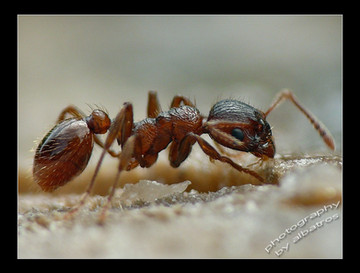 Small pavement ant is alone with a piece of sugar crystal.Image is taken in my kitchen.