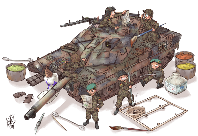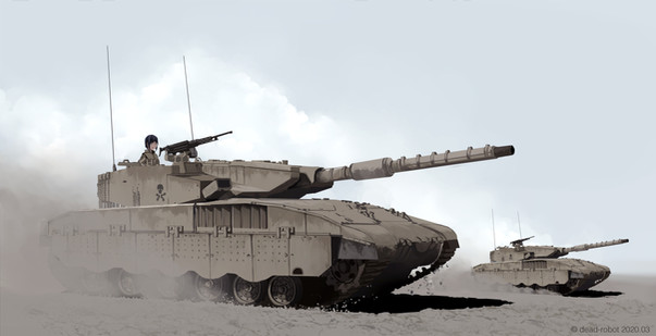 I really like the colors, you can be proud of it ! My only saying is about lineart, the equipments on the ground are less visible than the tank on the third plan, which has a very thick line o: