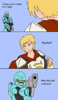 Yang raises her fist and strikes Caboose, only for him to catch it mid air. His quick reflexes surprised everyone. Yang's tries to yank off her fist from his tight grasps...