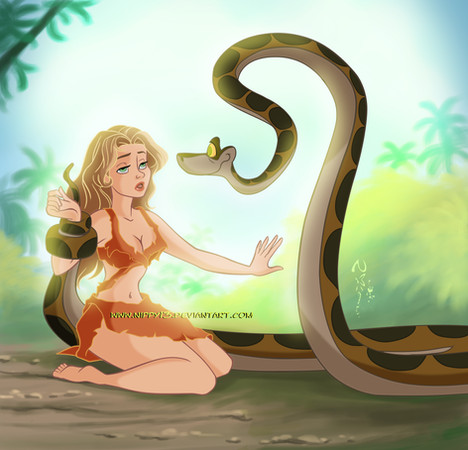 Beautiful, sexy woman... Willingly giving herself to the snake.... Does this one beg for a few more steps or frames? Absolutely! Great work!!!
