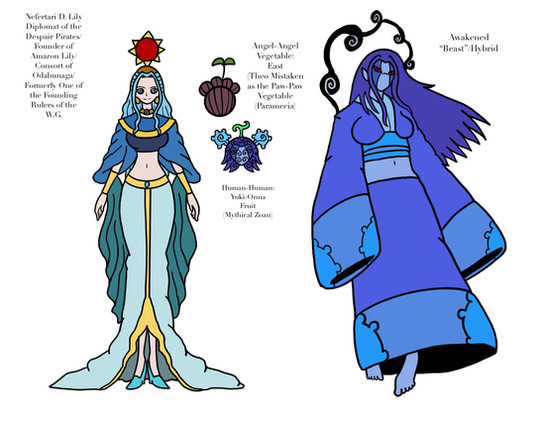 The 5th Primordial Fleet Captain of the Rocks Pirates, Sunnu D. Minerva is one of the 40 daughters of Sunny D. Joy- the first Joyboy and the Pirate King of Kings of 900-800 years ago. She and her sisters were what society now considers Ancient Weapons- which include Uranus/Zeus, Pluton/Hades, Poseidon, Hermes, Gaia/Demeter, Artemis, Athena, Apollo Ares, Hephaestus, Dionysus/Muse, Aphrodite, Hestia, Heracles, Hecate, Elpis, Morpheus Ananke, Helen, Echidna, Prometheus, Hebe, Hera, Eos, Pandora, Eris, Iris, Persephone, Cronus, Tyche, Selene, Brizo, Harmonia, Nike, Astraea, Helios, Nyx, Rhea, Amphirite and Andromeda. Ships associated with their names were actually tools made by the early iterations of the World Government in order to harness their powers. The actual names would be the Maidens of the World but that is an oversimplification. They're actually the concepts of what they embody given physical form via their birth by Geoise D. Mary- who is the incarnation of the GOD who created the world- with her marriage to Sunny D. Joy. Twenty of these Maidens were to be consorts to 20 select Kingdoms chosen by the people and the other twenty would be married to the respective Pirate King- including Joy's successor- as a sign of coexistence between the chaotic world of Piracy and the orderly world of the nations. Unfortunately, Joy had to sacrifice himself to seal VOID away and these Maidens and their mother were branded as traitors- with a loyal retainer named Toki having to send each of the maidens to select times in future while de-aging them into embryos via the Age-Age Fruit to be reborn into different parents to avoid detection. As the centuries passed, the Maidens were branded as evil pagan deities to be hunted down and Geoise D. Mary was written as a princess tricked by a DEVIL of the D-Clan to give birth to the unholy offspring. Only Shirahoshi is publicly known as the reincarnation of Poseidon and in private circles that Big Mom contains Gaia/Demeter aka Ataxia. Minerva was the quickest to be reborn of the Maidens- being birthed by the Merlin clan of the Magus- a race of long-lived individuals that were born with innate Sorcery Haki skills and longevity who live on Avalon. They would be hunted down by the World Government for being "unholy" but also their innate talent of understanding the Poneglyphs. Around 750 years ago, Pirates worshipping Davey Jones forced the Magus underground and renamed Avalon- Fullalead/Hachinosu Island. Minerva would be sent off to Elbaf to protect her from being abused by the Pirates. She has forced to swallow a Devil Fruit, Devil Vegetable, and a Devil Tomato- the Human-Human: Sage Mythical Zoan Fruit that gave her the power to turn into an elderly male wizard or a hag hybrid with added natural Sorcery Haki with the side-effect of gaining a manhood, the Know-Know Paramecia Vegetable to imbue her with omniscience/download information into others, and the Void-Void Logia Tomato that gave her the power to turn into a void to be immune to conventional attacks/use voids to attack enemies. She would then use her new identity as Merlin to become the Giant royal family's advisor- being the most close to Odin. When Farbuit's coup occurred, she and Odin were forced to flee and would go to become Pirates. They would find themselves in Xebec's services where Minerva would have a child with him called Rocks D. Fuffy. She initially was hesitant to work with him but she eventually became a solid if not reluctant ally of his. When the God Valley incident ended- Xebec had Minerva sent to the OLD WORLD for her own protection and Fluffy would grow under Vegapunk's care as his ward. Fluffy would have a child with a man of the 3 years and place the child under adoption- Koby. Making Koby Minerva and Xebec's grandson and Luffy's cousin. Minerva would await the day for Xebec's grandson to enter the OLD WORLD to become the next Pirate King...Due to her traumatic experiences, Minerva had become cynical, serious, pragmatic, unsociable, and reclusive- deliberately isolating herself from others. She cynically views races as fools who repeat the same mistakes over and over due to how long she's lived. Any attempt at interaction was brushed off by attacking or escaping. She hid behind the public persona of Merlin- a wise old man who seemed reasonable and sagacious. She kept herself in the distance as she observed the stupidity of others with annoyance. She has a personal, critical voice in regard to the actions and thoughts of others, being one to be able to organize others quickly, relay orders swiftly and be a strong advisor to leaders. She nitpicks the inane actions of others and gives small comments about the stupidity of the events transpiring while others would be more fully invested. Gradually due to Xebec's influence, she's become more open and sociable with her fellow crewmates. While on the Rocks Pirates crew- she initially had an aloof attitude towards their actions but gradually became similar to the Straw Hats- focusing on freedom valuing friendship, having a personal dream to open the OLD WORLD to the public- which is something her father/mother wishes, letting others decide who their heroes are, and not taking credit for her actions- which earned her some ire from some of the Fleet Captains. She was very close to Odin, Xebec, and the female Fleet Captains but the others either viewed her as dangerous or naive. She is guilt-ridden for her father's death- being very close to him before he died. After the God Valley incident, she now has more appreciation of others and secretly hopes for a crew that she can get along with soon- implied to be the Straw Hats. She is self-conscious of her biology and resents that she finds robots inherently cool- owing that to her male half. She seems to have split personalities much to her chagrin with the wizard "Beast" form having a wise, serious, and grave demeanor with some affable nature while the witch "hybrid" form is cackling, dramatic
