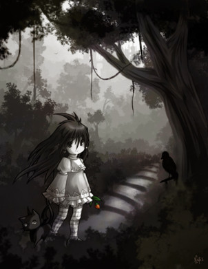 Wow great job, the contrast between the innocent-looking girl in the foreground and the wraith in the shadows behind is quite eerie and very cool. The symmetry of the piece I find really appealing too.