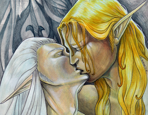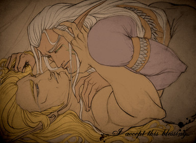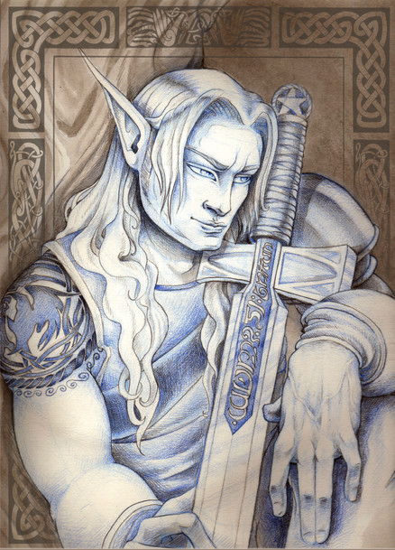 "Kalervo miró alrededor, tirándose de las mangas del traje, luego observó al paladín con curiosidad. Llevaba un tabardo negro con un sol bordado en hilo de plata en el centro, y los ojos estaban cubiertos por un resplandor dorado. Tenía cicatrices. Y emanaba un aura casi venerable que le obligaba a bajar los ojos de cuando en cuando. El enorme elfo que tenía enfrente le imponía de alguna manera. No era miedo exactamente. Era... como si de pronto estuviera delante de su padre."