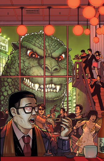 Extremely beautiful and awe-inspiring. The color choices are wonderfully unusual...they capture Godzilla's rage and the chaos of the scene. and I love the zipatone effects.