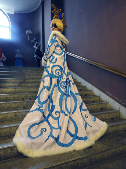 About the top underneath the coat, well, I basically made the pattern from clothes I had, sewn it together, adding an invisible zipper at the back of the neck. I used a very stretchy synthetic fabric for this. I made a fake "parting" (sorry, for the lack of vocabulary on this) at the front, by folding blue ribbon and sewing it on so it would look like the coat opens at the front.The belts around the chest required some precise measuring and aligning before sewing, because they do not stretch like the rest of the fabric. I made the golden buckles out of craft foam. The last part was painting blue designs at the back of the neck and bottom of the flaps at the back. These designs only appear in the artworks, so they're not absolutely necessary. Also, the fabric I used for this turned out to be slightly translucent, so I made a sort of undershirt that matched the upper part of the top from the same material. I had to do this all in a matter of three days, because I was running out of time, so I don't have any pictures that would make a decent tutorial. But I hope this will help you at least somewhat