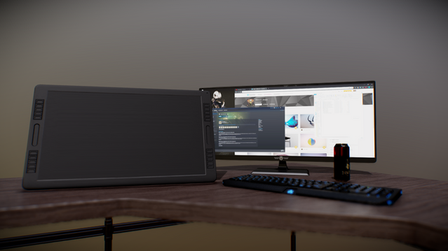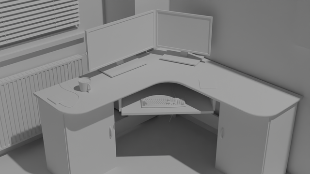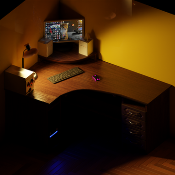 Modeled a small workspace in Blender. The cactus and the keyboard are not mine.Initially, I wanted to do it in bright purple shades, but then, after experimenting, I decided to stop at the blue backlight.