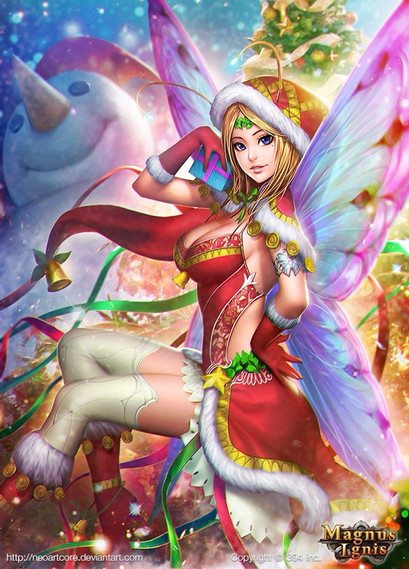 I do love your use of vibrant colors. I've gotten kind of bored of seeing so many fantasy artists using an all dark color scheme. Her pose is sweet and matches nicely with the candy colorings of her costume. It's eye-catching to see just a piece of the background being shown like that. I don't think it's ever occurred to me to try that so thanks for the inspiration. She would have popped much better if the background colors weren't matching so much with her outfit, maybe more of a neutral or muted background. I love the way the wings on the stocking go from a 2D pattern to a 3D object. I'd like to see the cloth hanging down her legs have more movement to it and not look as though it's clinging flatly to her legs. Lovely work as always.