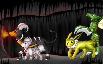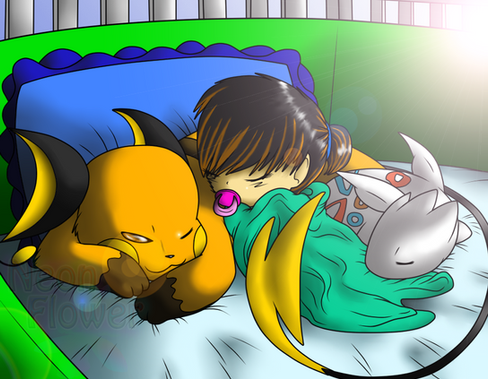 In this picture, they are confronted by two male Houndoom's who see Ashley as a good meal, because their territory is lacking prey to hunt. Over Charizard and Togetic's dead bodies. Firstly, Charizard fell in love with the child when she had come home for the first time from the hospital. Ever since then, he's been her large, oversized protector. Togetic, since being raised by Misty, see's Ashley as a little sister, and is her guardian.