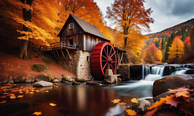Whispers of Autumn's Past: A Rustic Mill Amidst Golden Foliage and Cascading Waters,evoking a sense of nostalgia and the untouched beauty of nature reminiscent of Romanian highlands in their full autumnal splendor.