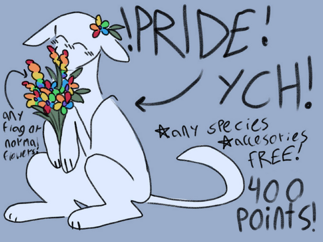 in case you can’t read the picture, which would make sense because my handwriting is bad, pride YCHs are open! I’ll draw anyone, human, furry, feral, etc. You can use your drawing as your profile picture if you credit me!it’s 20 points, comment to claim!