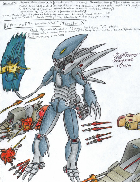 A light-attacking patrol ship w/only a few weapons and two mechs, so it can't really do much other than patrol the area. Sorry about the wrinkles in the paper from the scan, but it was done on notebook paper from my notebook for drawing in at school. Originally inspired by a crappy doodle I did on my Biology notebook...I mean, uh, I always pay attention at school...except in some parts of Bio, some parts of English, and almost all of French...Related content