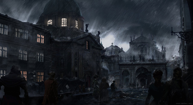 Love the style, and the grainy texture, especially in the sky; great amount of detail, as always. The rain is the perfect touch, adding an appropriate somber and melancholic mood. Overall, awesome work on this!