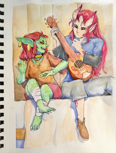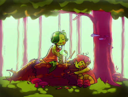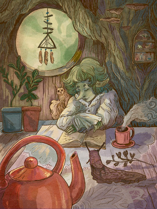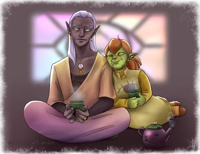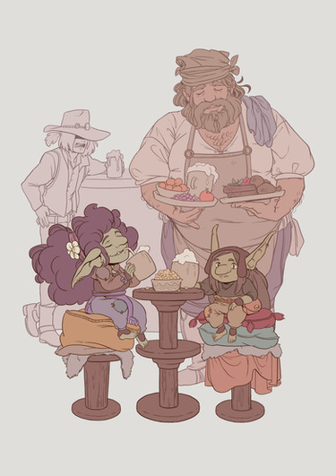 Had this one done for weeks now, but did not feel ok about showing it publicly. Feeling better about it now.Here we have Pippo, Dmitri, and Johann having afternoon tea. Dmitri and Johann were NPCs in the DND campaign Pippo originated from. I'd say Johann was the first friend she made there. He leads a Temple of Deneir in a small human town called Sofita. The two gnomes met through Deneir. Way back when the temple acquired a dangerous artifact, Johann requested neighboring temples to send some of their clerics over to assist with documenting and dealing with said artifact. Pippo, for whatever reason, was the only one that made it to Sofita. Immediately Johann and Pippo found commonality with eachother, both being gnomes from far away lands, both having the same faith.