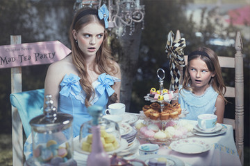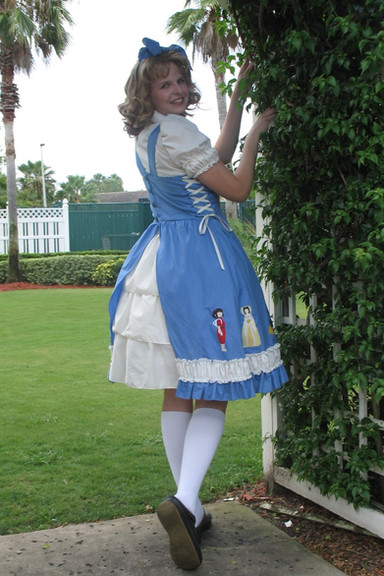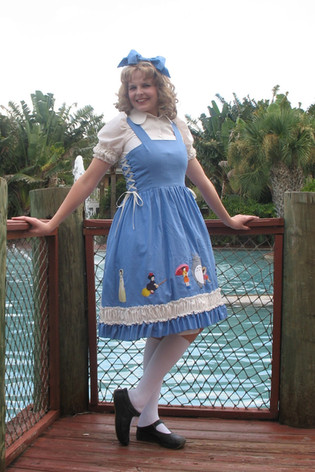 The dress itself is of my own design. I love full skirts, wide, high waistbands, and cap sleeves. I made my daughter a matching mini-dress and she helped me pick out the flowers for the hair accessories and the beads for the necklaces. I love the little Swarovski crystals at the center.