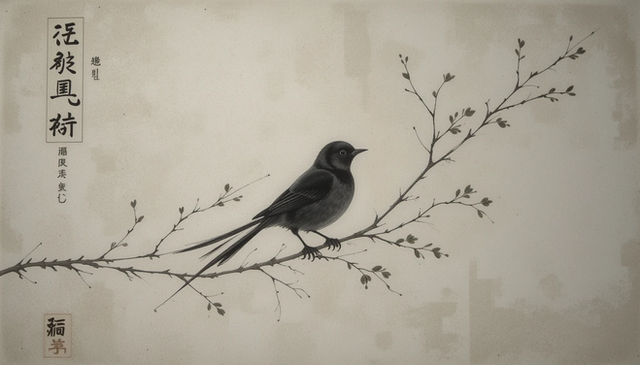 This image is a reinterpretation of Hiroshige's print "A Bird Clinging to a Tendril of Wisteria"