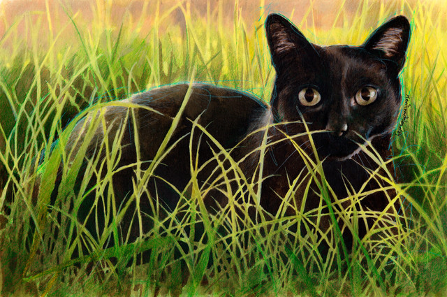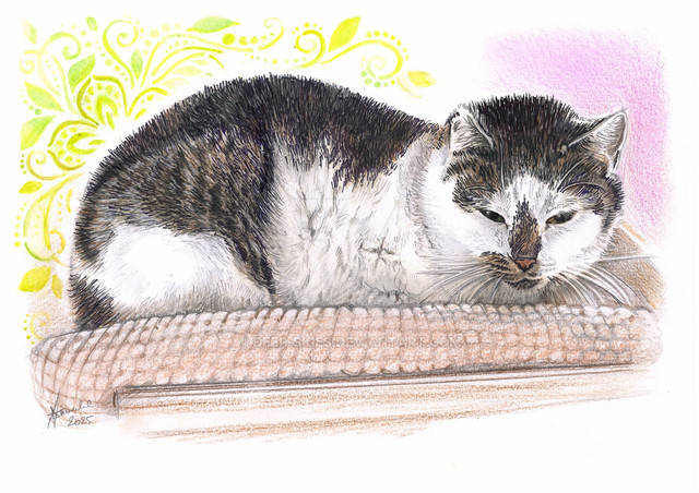 So, she was the "Oddball" of the litter. She and my husband had built a strong bond over the years. She passed away over the Thanksgiving holiday. In her memory, I've created this 8x10 inch drawing with colored pencils.