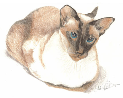 This is a pet memorial portrait.It's a personal piece, I created for my husband. His siamese kitty was the only siamese cat in a litter of black cats and tuxedo cats.