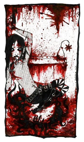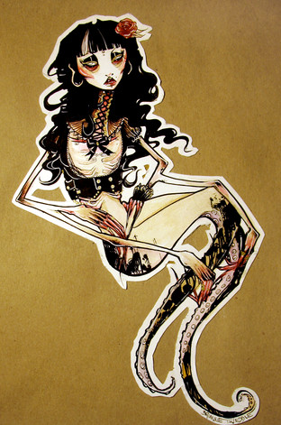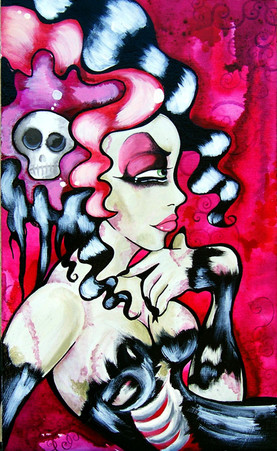 I love this. I love the coils of her hair, the snarling fingers, the glitter, all of it. But what I love most, and what seems to be rather different from most of the work, is that you've used the entire canvas. The composition isn't plunked into the middle of a page, it consumes the page. You've got some amazing painting skills, also. Everything I paint turns to mud.