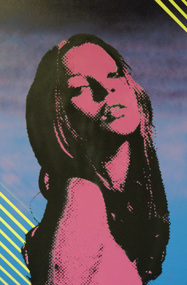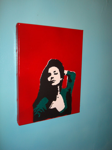 top half is freehand, the girl & shoe are seperate stencils, 4 layers each.Β moltow & mtn 94 on canvas.