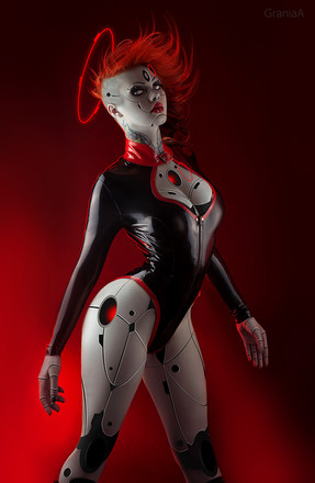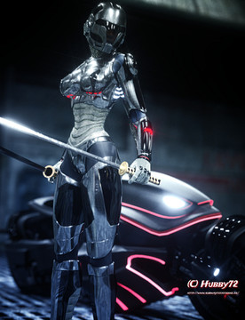 Man, this is incredible artwork. I really like the blue and white shades on the shine, it really gives the robotic, platinum look a big pop. The pose (and I guess also the sword sheath, lol) give it a malicious look that makes me think of the movie Ex Machina. Also the background, even though altogether plain, fits very well for the theme of the picture. Amazing job homie.