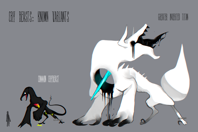 Chrymbeasts are anthro and the vvivvidium makes up their bodies and they have a mixture of black and white innards. Their very existence is toxic to other crybeasts, so they're usually driven away and actually much rarer than even inverted titans.