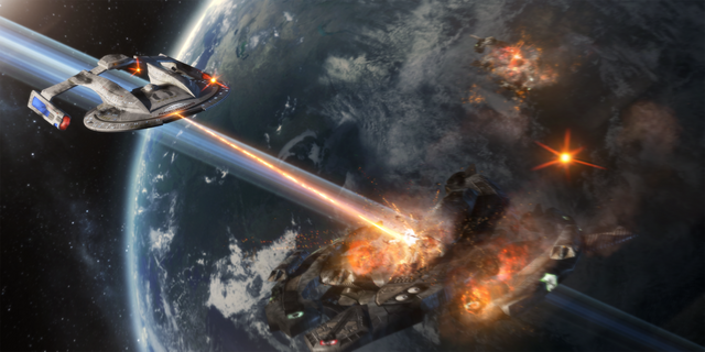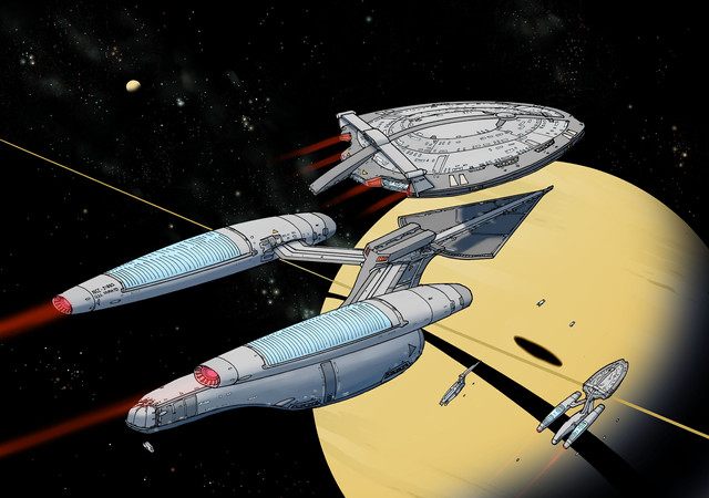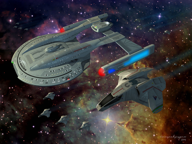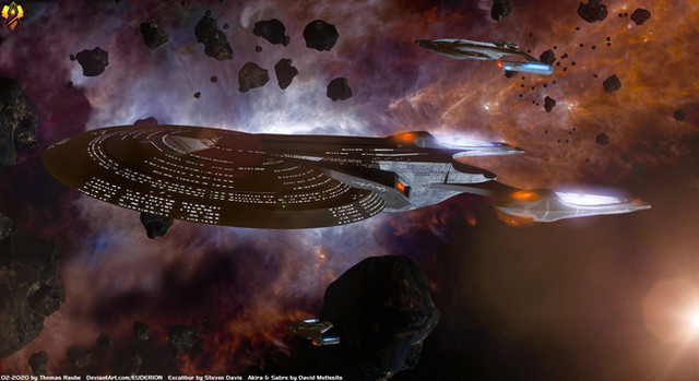 The Akira and Steamrunner classes are listed as Escort vessels due to their size, but during the Dominion War every ship mattered. During those battles these little but mighty classes proved their worth in a fight on a regular basis. Now trapped in the Gamma Quadrant they once again show that they are very capable indeed. Here we see the USS Kusanagi and the USS Osana charging into battle again the Ascendant's forces.I would like to put out a huge thank you to for putting this request together. After seeing several of his over pictures with starships in battle I asked him to do something similar with two of my Star Trek: Gamma Fleet Operations ships. And damn if he did a hell of a job! If you are unfamiliar with his work you should definitely go check it out. Beside some of the incredible Jet designs he has, he has some incredible Star Trek work. Here are a few example;