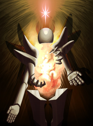The figure's headspace is in an entirely different place than reality, entirely disconnected from what is happening around it, channelling a much more favorable image, into its beam of destruction--it's grand vision that holds its attention. The trail of the beam is broken up and staggered, showing that it goes through lapses of time where it comes out of its headspace, though it inevitably returns there, as that is its natural state of being.