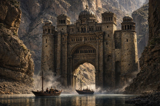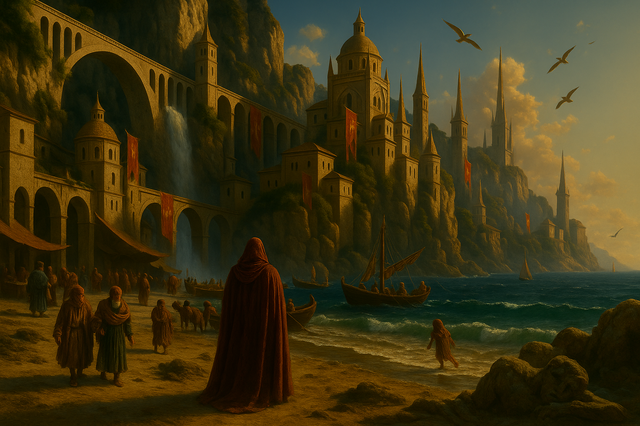 #digitalart #fantasyart #architecture #sky #sea #boats #clouds #coast #fisherman #gate #persian #porto #ruins #sand #towers #old #palmars