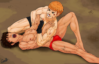 The Aussie Lion is in seeming control of every turn. He stalks his prey and gives him no breaks, putting him in one torturous position after another. Here he has his bigger opponent trapped in a variation of headscissors, his feet slowly constricting the Golden One's air flow, while giving his arms a good stretch simultaneously.Not only is the Aussie out to win, he's here to inflict pain, and Golden finds out the hard way. He won't give in though as he fights the hold, but he intense struggles proves to be fruitless against the vicious Aussie Lion.