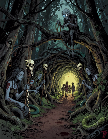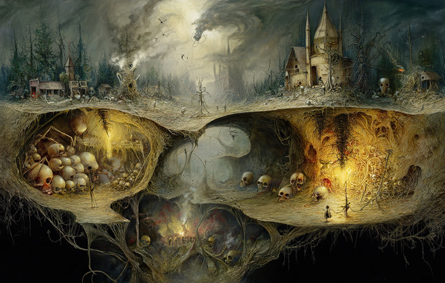 I really like the perspective you drew this from, looking down as if we're overhearing a conversation, which of course is the intention and the title. The tomb/crypt look so spooky, certainly no place anyone in their right mind would want to enter, and the Stone skeletons add to it's the overall creepiness. The tall bald fellow appears 'simple' perhaps or maybe he's just puzzled. Regardless, the highly detailed atmosphere and effect you have created is simply amazing. Wonderful work. Congrats on the DD.