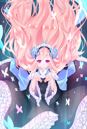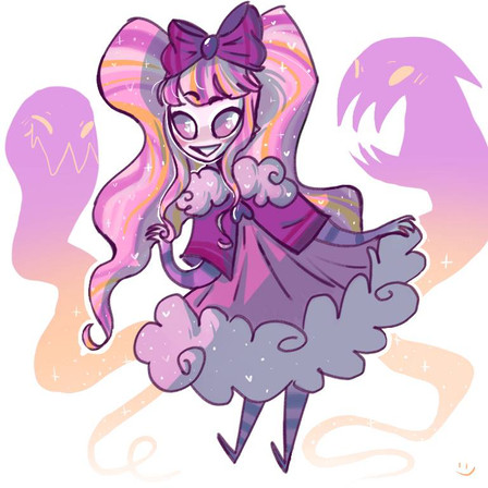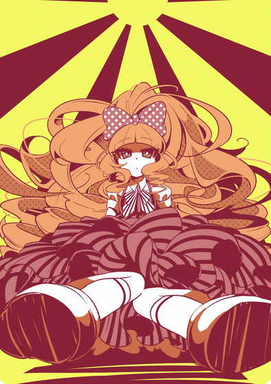 anyway yeah the image pretty much came to my head right away and i was like aw i can't not draw that! very obviously a photoshoot scenario here, her hair is held up with clear string...it wasn't easy to set up! her hair does take a bit of effort to uncoil. the outfit is somewhat of a callback to what she wore for the audition , but y'know, way fancier, as befitting of the finale. it includes elements of her other outfits throughout the pagent, like bows, tulle fabric, glitter, etc