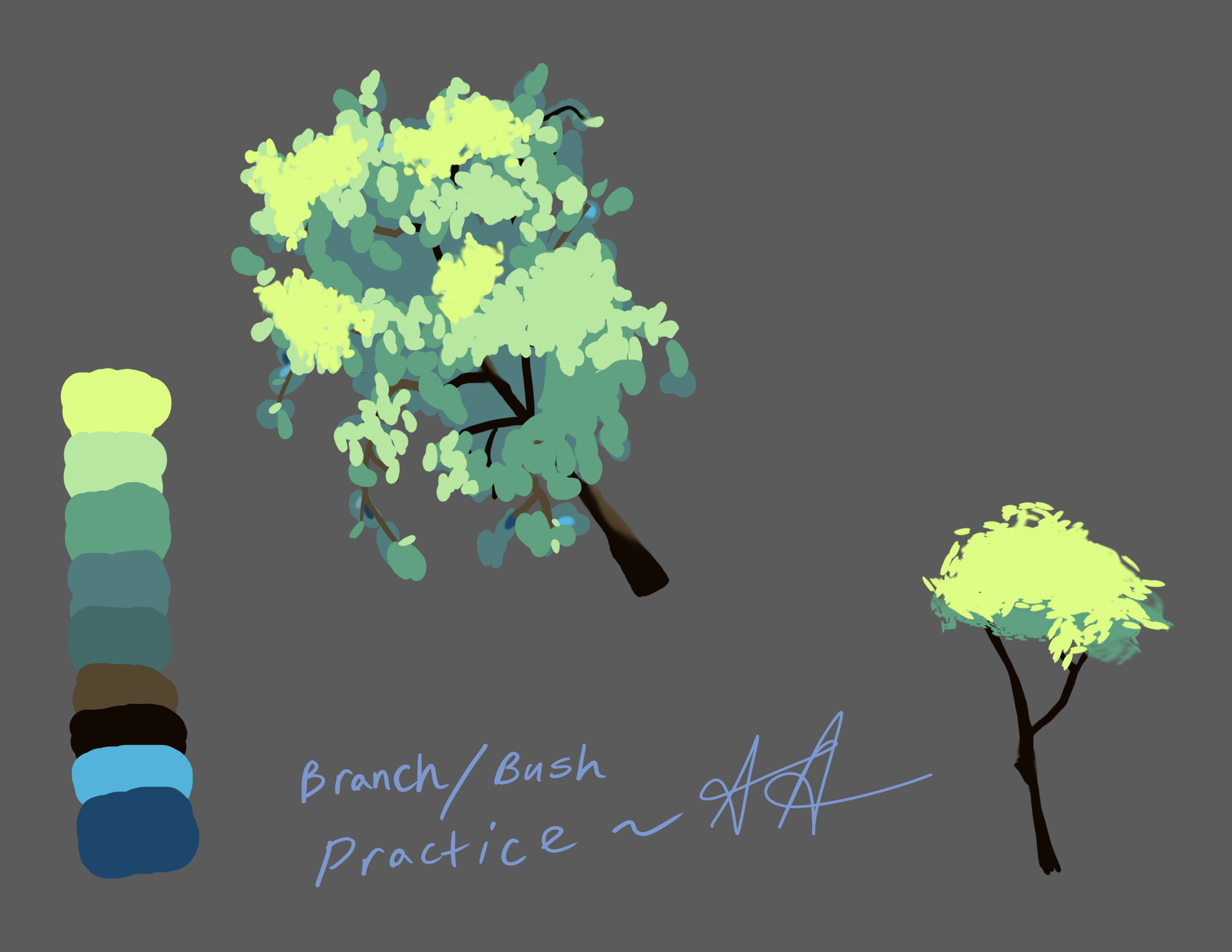 Just some practicing I did really quickly in Photoshop! I've been inspired by a lot of tutorials on foliage and tress. This was to test out how to make a bush/tree in a sort of realistic style. I've been practicing to try and develop some concept on scenery. To be honest, the little bush on the right looks the best. I'll keep practicing so I can improve!