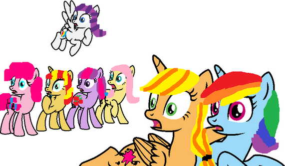 Rainbow noticed Sweetie Belle staring at them and flew over. "Hey Sweetie Belle. Don't be scared. Rarity's just having fun."