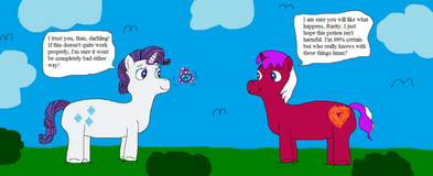 Rarity's eyes snapped open, and she ran out the door without a second thought. Rainbow followed her, and soon saw Rarity hopping in a big mud puddle next to the Carusal Boutique. Sweetie Belle, who had been playing over at Sweet Apple Acres and was now returning home, saw her sister jumping in mud with no protection. The filly's jaw dropped.
