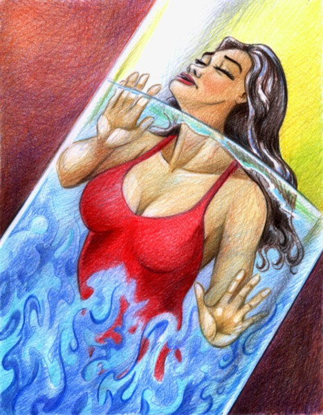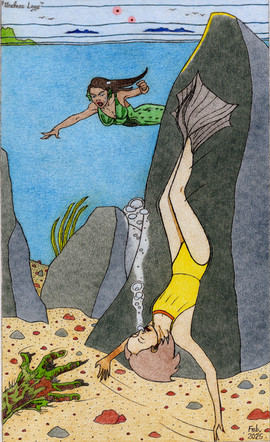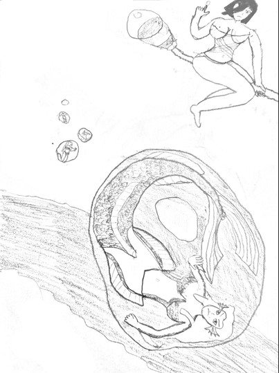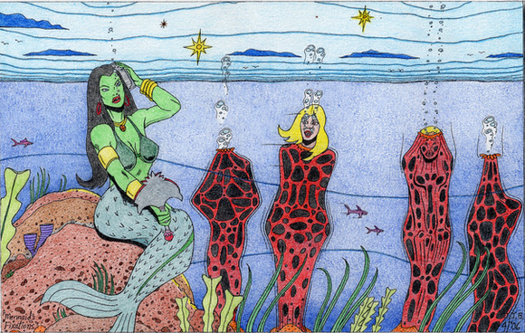 Despite a busy September for me IRL, I made time for a new artwork. Here, a lovely (?) mermaid is absolutely elated at seeing her shell trap in the process of bubblizing a third over-curious human swimmer. She approached the exotic item too closely in shallow water, suddenly was bathed in an eerie light, and could no longer escape its power in a weightless state. Lots of detail hopefully to be colorized later. Did I give too much away? Think you can hear her scream from this distance?Related content