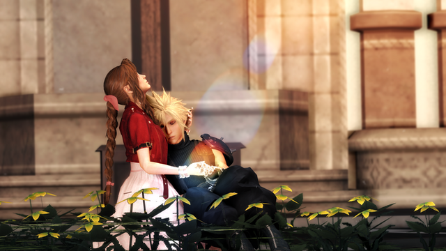 Awww. :3 Yes, very comfy isn't it, Aerith? x'3 Don't get Zack distracted anyway. I love this, so sweet.
