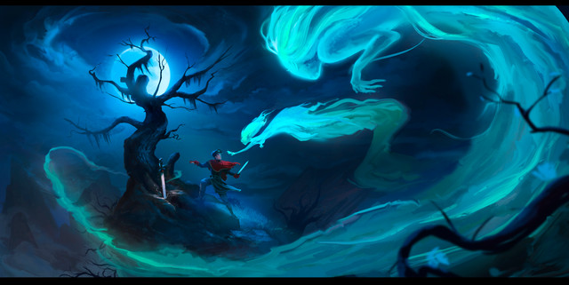 Even though there's only one color in many tones I feel like this is really well done. Love how defined the dragon's face is and the rest is almost like just a feel. Like it's a sort of ghost asian dragon but the environment is even more ghostly than itself.