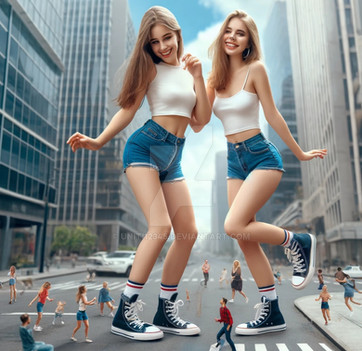Since the use of growth pills got mainstream, no one is wondering anymore about 30ft tall school girls in the middle of the road in the big cities. As Tom and his girlfriend Sarah are strolling trough the streets of berlin, they pass by two massive pair of legs just right beside of them. Tom coudln't handle his couriosity and looked up to them, or better said "under" them. As Sarah noticed his little peek, she instantly pinches him "You naughty idiot, what are you doing?!" - "Oh ehm, I just wanted to see what they are doing there..."The two continued on their way when they heard the two girls whispering behind them: