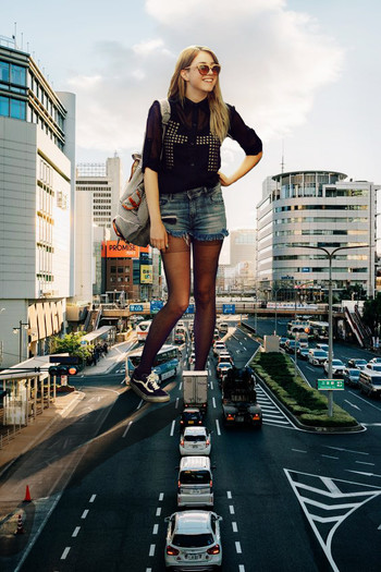 Mid-moderation, however, an unexpected shift occurred. Jasmin, in the midst of her poised and professional delivery, halted momentarily. A subtle expression of surprise crossed her face as she felt a peculiar sensation coursing through her body. In the blink of an eye, Jasmin began to grow, her height rapidly surpassing her previous stature. She ascended to an astonishing 17 meters, her heeled boots now nearly 2 meters high. The transformation was met with the uninterested glances of pedestrians transforming into awe as they gazed up at the colossal figure that Jasmin had become. Undeterred, Jasmin seamlessly adapted to her newfound height. A smile played across her face as she acknowledged her rapidly growing follower count. The once indifferent bystanders erupted into applause, appreciating the unexpected spectacle that unfolded before them.