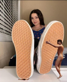 I started to clean the checkered sole profile of her Vans with my tongue, but after only a few minutes she pulled her feet apart and looked at me with a mixture of a dirty and at the same time malicious grin. "Did I tell you that I have always dreamed of controlling such a submissive and helpless man? I can't tell you how much it turns me on to see your small body, so small that my left shoe alone covers your entire upper body!" Suddenly I was overcome by an uneasy feeling, the situation suddenly got completely out of hand. "But I think you're not small enough. I saw that you have several of those pills with you. How about you take another one? Or how many do you have to take to fit in my shoe while I'm wearing it?"