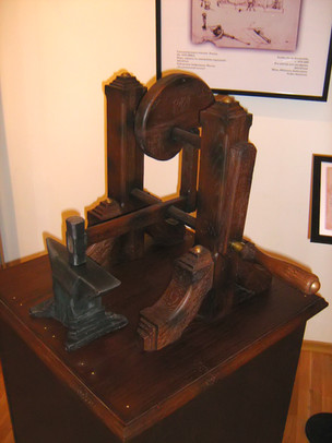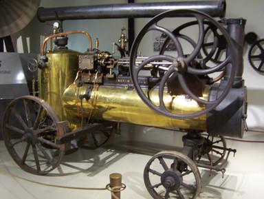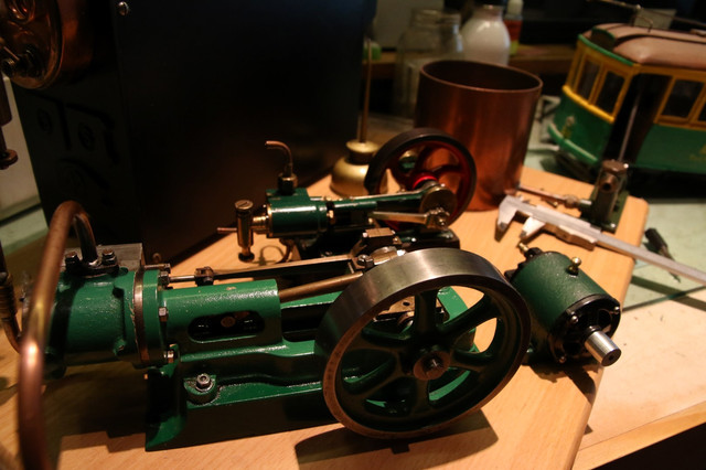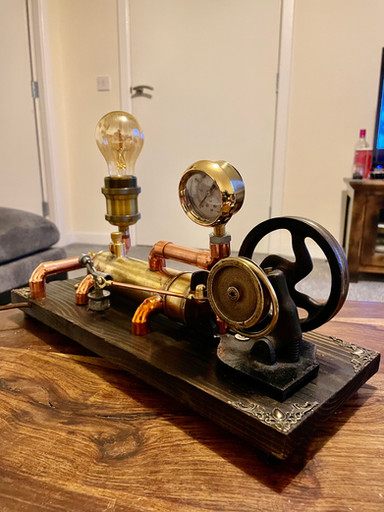 This is a small working steam engine. There is no boiler, and I would recommend using actual steam, but if air is blown into the small pipe on the left, the engine will run.The copper bits were made from 1/2" copper pipe, cut, worked, and soldered into the correct shape. Other pieces were made from brass rod.