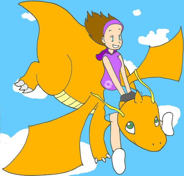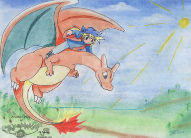 This is such a fun picture. It makes me want to go "Whee!" when I look at it. If only we really could ride on the back of a Charizard.... And I think you used the smudge tool very well.