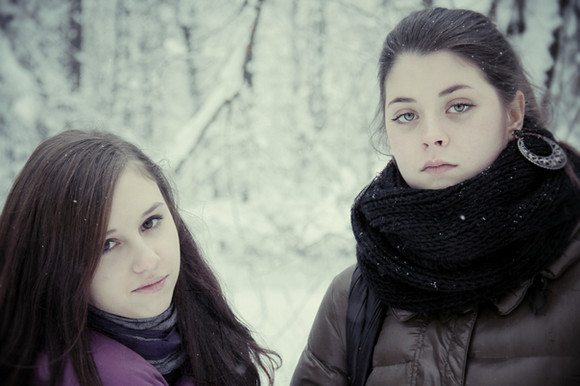 it is interesting that the girl with the darker hair is also wearing a (slightly) darker sweater. their different poses in this shot work well; it feels like the viewer has just interrupted thei conversation, and made them look. what were they talking about? the brunette in this shot is especially beautiful to me.