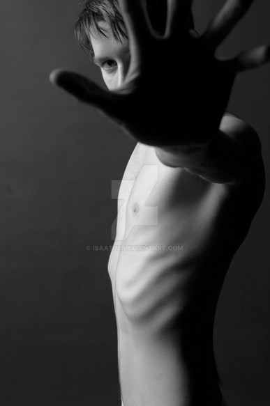 It is a great picture. By isolating the trunk and arms, you have seemingly elongated the form; thus attenuating the already skinny proportions on show. There is a sense of reticence in the folding of your arms around your stomach - almost suggesting the love/hate dialogue in anorexia, the love of control, yet hate of appearence. It could also be a literal depiction of the tenderness (if not outright gut wrenching pain) one feels from starving themself.