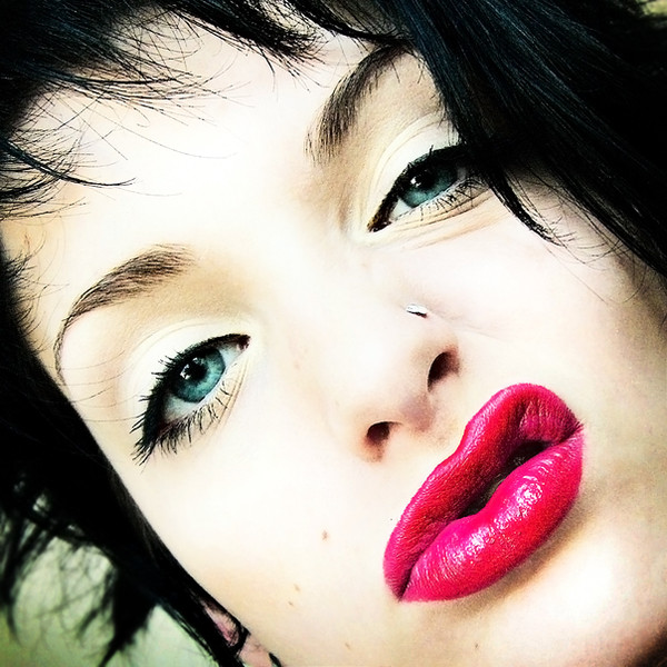 isnt there a rule... "let thine lip liner be lighter than thy lip colour" dont ask me how i know that as a male i just do... but for this picture its a very cool effect reminds me of fruit... im imagining a kiss that tastes tangy and delicious.. lovely colours and the eyes are lovely aswell..