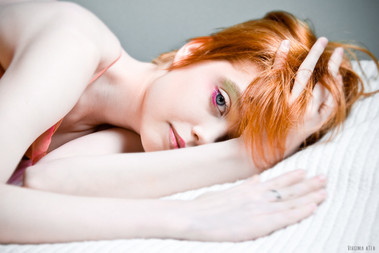 Well, she is just stunning! I love the bra, the make up, the lighting... Sort of a relaxed pin up girl. Very well done! I also think her pale skin is just stunning! I myself am a pale girl, and I think it can be just gorgeous as tan, and this model seems to prove that!